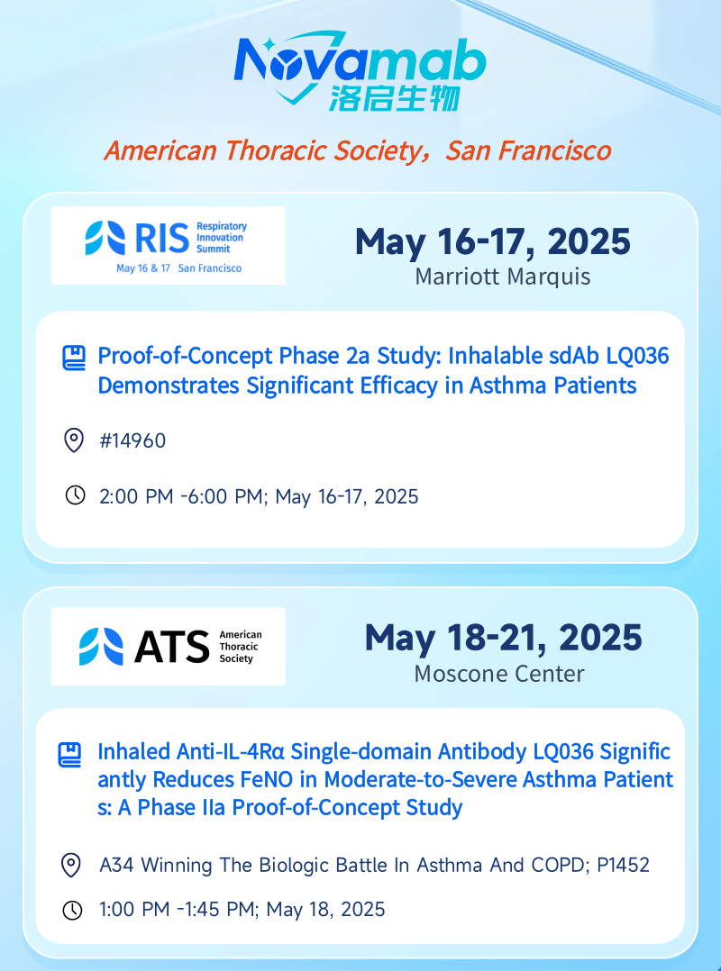 中国上海,2025年5月13日——上海dcbox小金库app生物医药技术有限公司,一家专注于纳米抗体创新药研发的生物技术企业,今日宣布:dcbox小金库app生物将于当地时间5月16日至21日赴美国加州旧金山,受邀参加美国胸科学会(American Thoracic Society, ATS)主办的呼吸创新峰会(Respiratory Innovation Summit,RIS)及ATS国际大会。届时dcbox小金库app生物将分别在RIS和ATS两场大会上以壁报形式呈现最新临床数据——公司自主研发的靶向 IL-4Rα 吸入性生物制剂 LQ036 首个 IIa 期概念验证性临床试验数据。本次展示将全面披露 LQ036 在中重度哮喘患者中的安全性、耐受性、药效指标及初步疗效,标志着dcbox小金库app生物在下一代呼吸道吸入式生物制剂开发领域迈出关键里程碑。